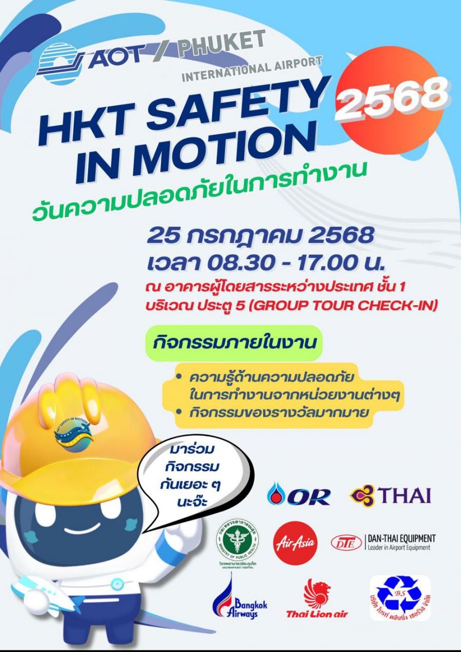 วันนี้ 25 ก.ค.68 เวลา 09.00 น. นางเปมิกา สีสาคูคาม รองผู้อำนวยการท่าอากาศยานภูเก็ต สายสนับสนุนธุรกิจ (รภก.(สธ.)) เป็นประธานในพิธีเปิดโครงการ วันความปลอดภัยในการทำงาน ประจำปี 2568 เพื่อส่งเสริมให้พนักงานและลูกจ้างของ ทภก. สายการบิน และผู้ประกอบการ มีความตระหนักรู้ด้านความปลอดภัย อาชีวอนามัย และสภาพแวดล้อมในการทำงาน อีกทั้งเพื่อส่งเสริมการมีส่วนร่วมในการป้องกันอุบัติเหตุและการเจ็บป่วยจากการทำงาน โดยได้รับเกียรติจาก นายธนพงศ์ อรชร สวัสดิการและคุ้มครองแรงงานจังหวัดภูเก็ต บรรยายพิเศษในหัวข้อ ?ภาพรวมการดำเนินงานด้านความปลอดภัย และการตระหนักรู้กฎหมายที่เกี่ยวข้องกับการทำงาน? ในการนี้ ว่าที่ร.ต.ภัทราวุธ ประทีป ณ ถลาง รองผู้อำนวยการส่วนงานสารนิเทศสายสกุลสัมพันธ์(ตัวแทนในนามสภาสกุลวงศานุสรณ์) ได้ร่วมในการนี้ด้วย นอกจากนี้ยังมีกิจกรรมให้ความรู้จากซุ้มกิจกรรมของหน่วยงานต่าง ๆ อาทิ โรงพยาบาลวชิระภูเก็ต (กลุ่มงานอาชีวเวชกรรม), บริษัท ปตท. จำกัด (มหาชน), บริษัท การบินไทย จำกัด (มหาชน), บริษัท การบินกรุงเทพ จำกัด (มหาชน), บริษัท ไทยแอร์เอเชีย จำกัด, บริษัท ไทยไลอ้อนเมนทารี จำกัด, บริษัท แดน-ไทย อีควิปเม้นท์ จำกัด และบริษัท ไบรท์ คลีนนิ่ง เซอร์วิส จำกัด ณ อาคารผู้โดยสารระหว่างประเทศ ชั้น 1 ทภก. ******************* S:0