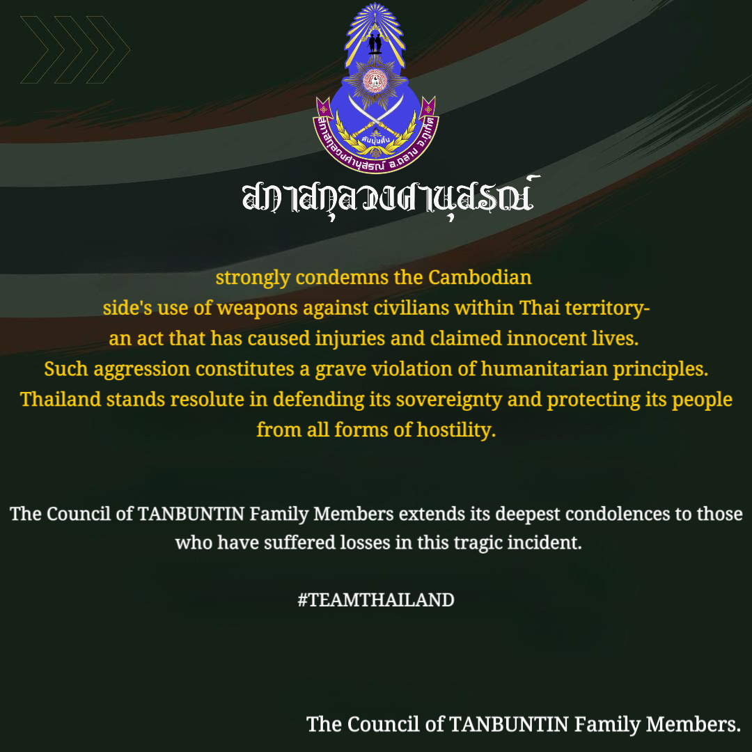 The Council of Pradip Na Thalang in TANBUNTIN Family Members strongly condemns the Cambodian side’s use of weapons against civilians within Thai territory - an act that has caused injuries and claimed innocent lives. Such aggression constitutes a grave violation of humanitarian principles. Thailand stands resolute in defending its sovereignty and protecting its people from all forms of hostility.